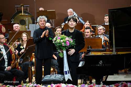 第2楽章では、チョは弱音のわずかな変化で作品の色彩の妙をとらえる。そしてときおり管楽器を見やりつつ、室内楽的な親密さで音楽をつくりあげた。ここではビシュコフも指揮棒を置き、やわらかな手の動きだけでオーケストラを導く。